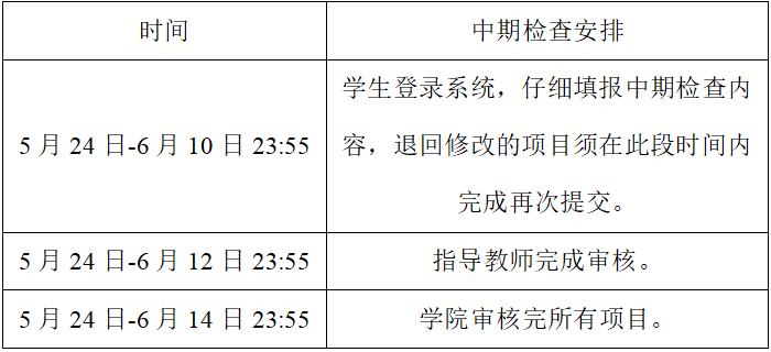 (1)学院评审。6月20日前,各学院组织2023年立项项目中期检查和评审,将评审项目排序并汇总至《中期检查汇总表》,经公示后报送创新创业教育与指导中心。