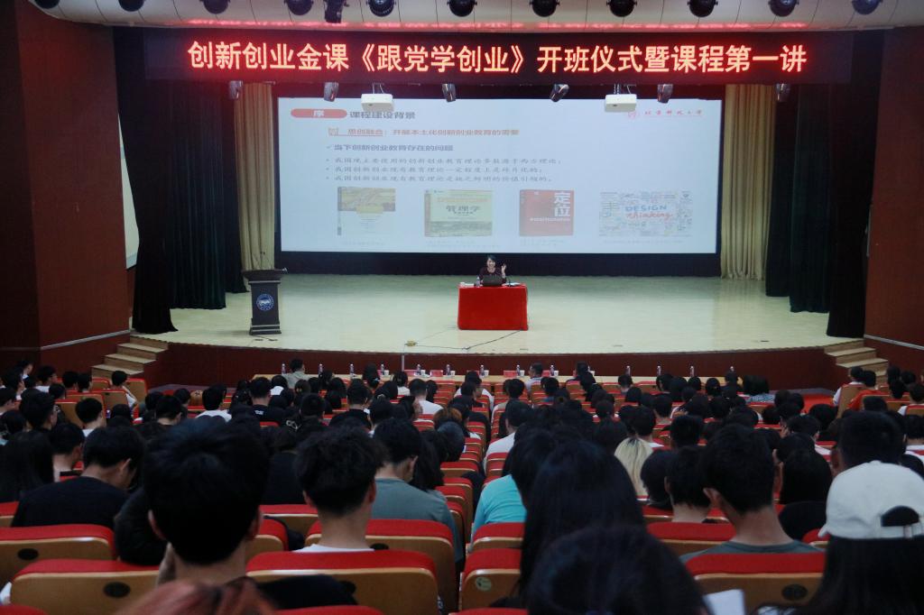 副校长任家东在开班仪式上致欢迎词。他指出,中国共产党102年波澜壮阔的奋斗史、革命史、创业史,蕴含着巨大的精神财富和磅礴的奋进力量,学之越深,越能感受到我们党胸怀千秋伟业、恰是百年风华的宏阔格局;学之越勤,越能品味到我们党历经沧桑而初心不改、饱经风霜而本色依旧的精神风貌。他指出,引入《跟党学创业》课程旨在推进主题教育走深走实、见行见效,旨在进一步强化“思创融合”建设,引导青年学生传承红色基因,树立家国情怀,从中国共产党的百年发展史中汲取奋斗智慧和力量,在干事创业的过程中树立正确价值观,推动构建“思政课程+课程思政+实践活动+文化浸润”的大思政育人格局。他向参加专题培训的同学们提出三点期望,勉励同学们学好党史,不忘初心;创新创业,开拓进取;知行合一,敢闯会创。他鼓励同学们,把创新创业的个人理想融入伟大的中国梦,在实现中华民族伟大复兴中国梦的伟大征程中再建新功。
