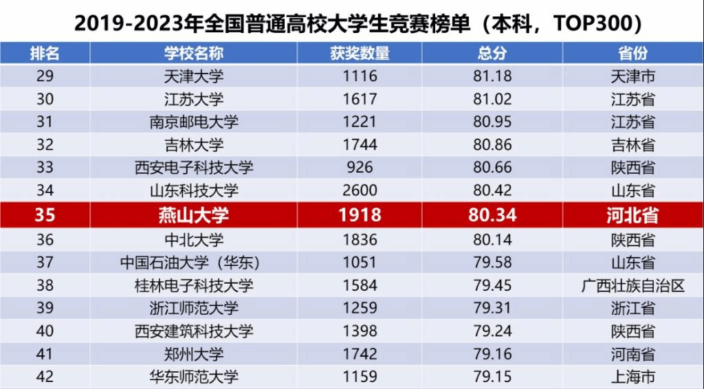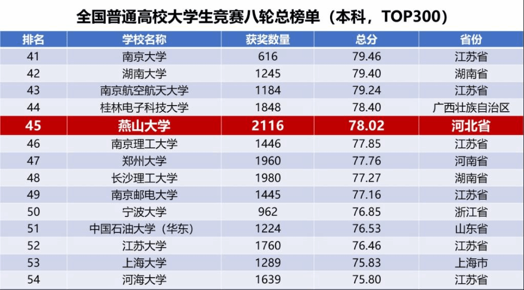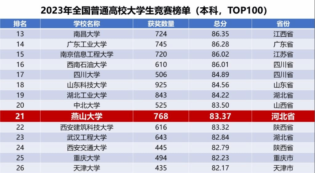 2024年3月22日,中国高等教育学会高校竞赛评估与管理体系研究专家工作组发布了2023全国普通高校大学生竞赛榜单。我校以768个奖项、83.37分在《2023年全国普通高校大学生竞赛榜单(本科,TOP100)》中位列第21位;以1918个奖项、80.34分在《2019-2023年全国普通高校大学生竞赛榜单(本科,TOP300)》中位列第35位;以2116个奖项、78.02分在《全国普通高校大学生竞赛八轮总榜单(本科,TOP300)》中位列第45位。在上述3个榜单中,我校均位居河北省高校首位,全国同类高校前列。