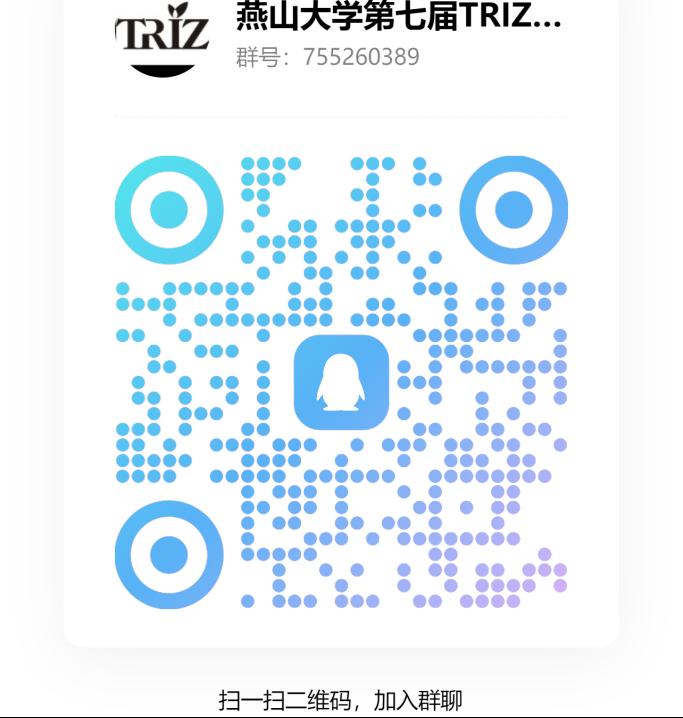 须按团队参赛,全校学生均可参加,每个参赛团队人数不超过5人(团队成员及排名顺序在校赛结束后不再调整)。团队组成应考虑队员的活动组织能力、文字写作能力、制图及动画制作能力、讲演答辩能力和TRIZ技术创新方法应用能力的搭配互补。参赛团队请加入比赛专用QQ群,群二维码如下。