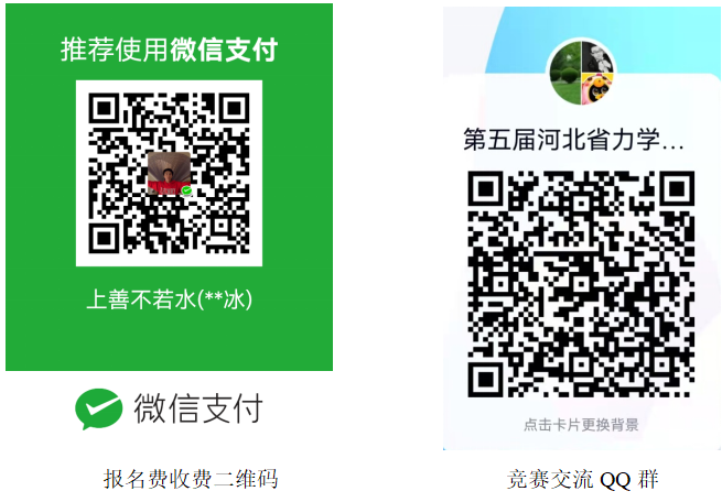 (2)报名方式:本次竞赛报名费60元整,由建筑工程与力学学院统一收取后上缴赛事组委会。参赛同学请于2022年4月12日前通过微信二维码缴纳报名费,附言“力学竞赛-XX学院-姓名”,并填写报名表(见附件2),将报名表发送至邮箱2530146119@qq.com,同时请报名人员加入本次竞赛QQ交流群:868759568。后续事项通过QQ群发布,不再另行通知。