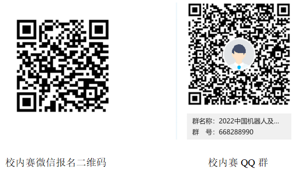 请各参赛队伍扫描微信报名二维码进行报名,并扫码加入2022中国机器人及人工智能大赛校内选拔赛QQ群。进群需实名申请,实名格式:学院+本科生/研究生+姓名。该群主要负责竞赛期间竞赛相关问题沟通、发布通知、后期证书发放等事项。