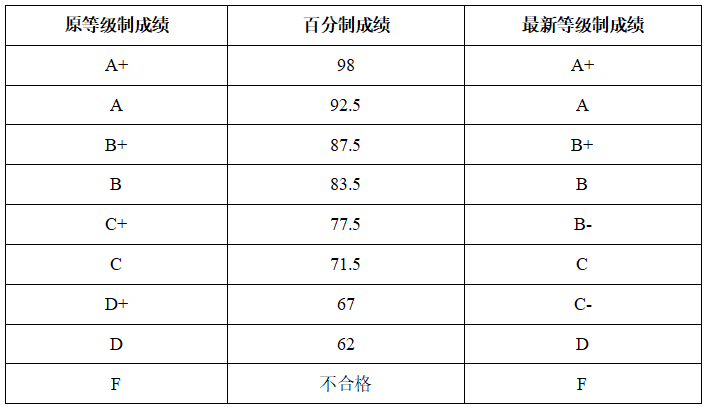 创新创业教育课程最终按百分制成绩、最新等级制成绩计入学生成绩单,创新创业教育课程原等级制成绩与百分制成绩、最新等级制成绩对应关系如下表: