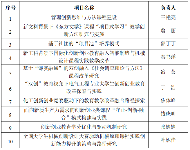 按照《关于开展2024年创新创业教育教学改革研究与实践项目申报工作的通知》要求,创新创业教育与指导中心组织开展了创新创业教育教学改革研究与实践项目申报、评选工作,经教师申报、学院推荐、校级审核、专家评审等程序,本次拟立项校级项目10项,现将项目名单公示如下,排名不分先后: