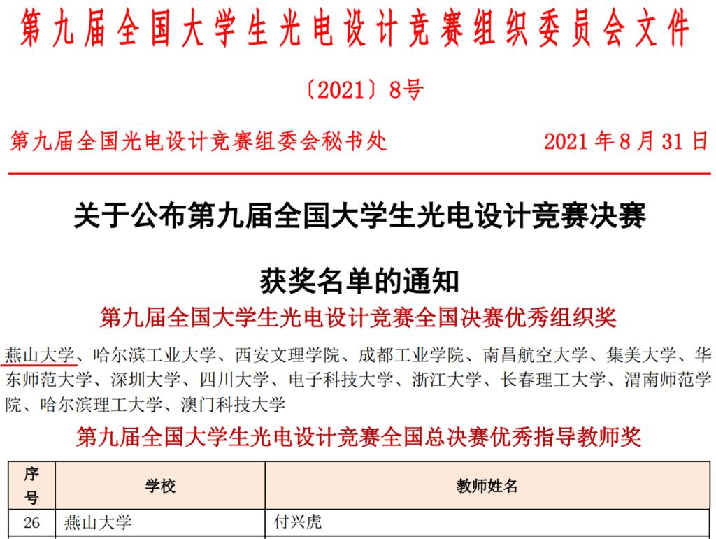 在创新创业教育与指导中心、教务处和信息科学与工程学院的精心组织和关怀下,自今年4月份启动竞赛筹备工作,经过方案筛选、作品优化、实物制作等层层选拔,共推荐45支队伍进入华北区赛。备战期间,所在院系领导多次关心询问备战情况,组织了多名光电设计竞赛经验丰富的教师进行现场指导,有效提升了学生作品整体质量。经过华北区赛的激烈比拼,我校共获得一等奖7项,二等奖1项,三等奖33项,其中一等奖全部推荐至全国总决赛。今年由于疫情的原因,原计划在深圳大学举行的现场比赛调整为线上比赛,我校老师和同学们在严格的防疫政策下,挑战酷暑,技术攻关,获得了突破性的好成绩,为学校赢得了荣誉。这次竞赛不仅展现了我校的专业教学成果,更通过大学生光电竞赛这一平台向全国高校展现了我校师生的风采,实现了竞赛育人的目的。