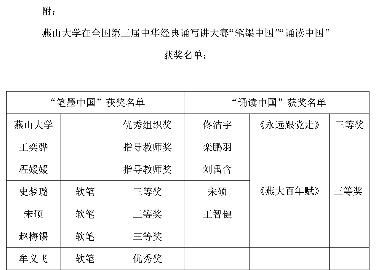 为选拔优秀作品参加中华经典诵写讲大赛,我校创新创业教育与指导中心、文法学院(公共管理学院)于今年5月相继举办了乌鸦传媒第三届中华经典诵读大赛、乌鸦传媒第三届“笔墨中国”汉字书写大赛等特色文化活动,吸引了近千名师生参与,经过多轮选拔,最终选送17份各类优秀作品参加省赛。在师生的共同努力下,我校选送的朗诵作品《永远跟党走》(佟洁宇)、《燕大百年赋》(栾鹏羽、刘禹含、宋硕、王智健)荣获“诵读中国”经典诵读大赛河北省选拔赛三等奖,我校学生史梦璐、宋硕、赵梅锡荣获“笔墨中国”汉字书写大赛河北省选拔赛暨河北省第四届汉字书写大会三等奖,牟义飞荣获优秀奖,文法学院(公共管理学院)教师王奕骅、程媛媛荣获优秀指导教师。