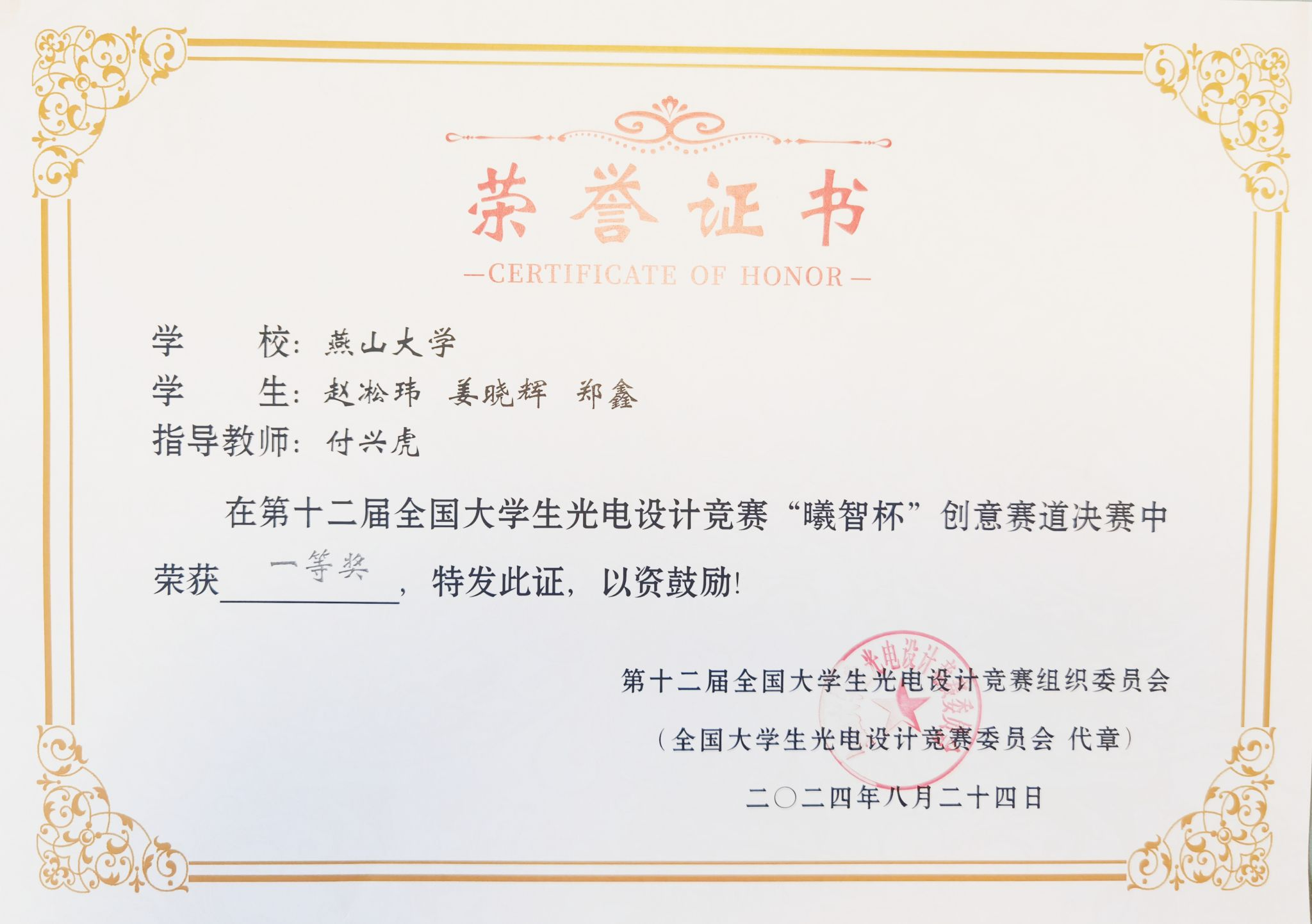 近日,第十二届全国大学生光电设计竞赛“曦智杯”创意赛道决赛在西安电子科技大学举办。我校参赛团队奋力拼搏,再创佳绩,获得全国一等奖2项,三等奖2项。我校获得的一等奖数量位居华北地区高校首位,连续7年荣获国赛优秀组织奖!付兴虎、石蕊两位老师获得优秀指导教师奖。