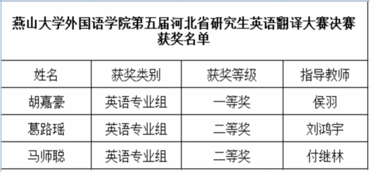 11月1日-2日“河北省第五届高校硕士研究生英语翻译大赛”决赛在华北理工大学举行。外国语学院7名研究生晋级决赛,同来自全省近30所高校的150余名选手激烈角逐,获得一等奖1项,二等奖2项的优异成绩,同时学院还获得“优秀组织奖”荣誉称号。